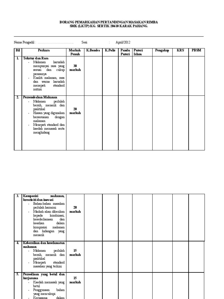 Borang Pemarkahan Pertandingan Memasak Docx Document