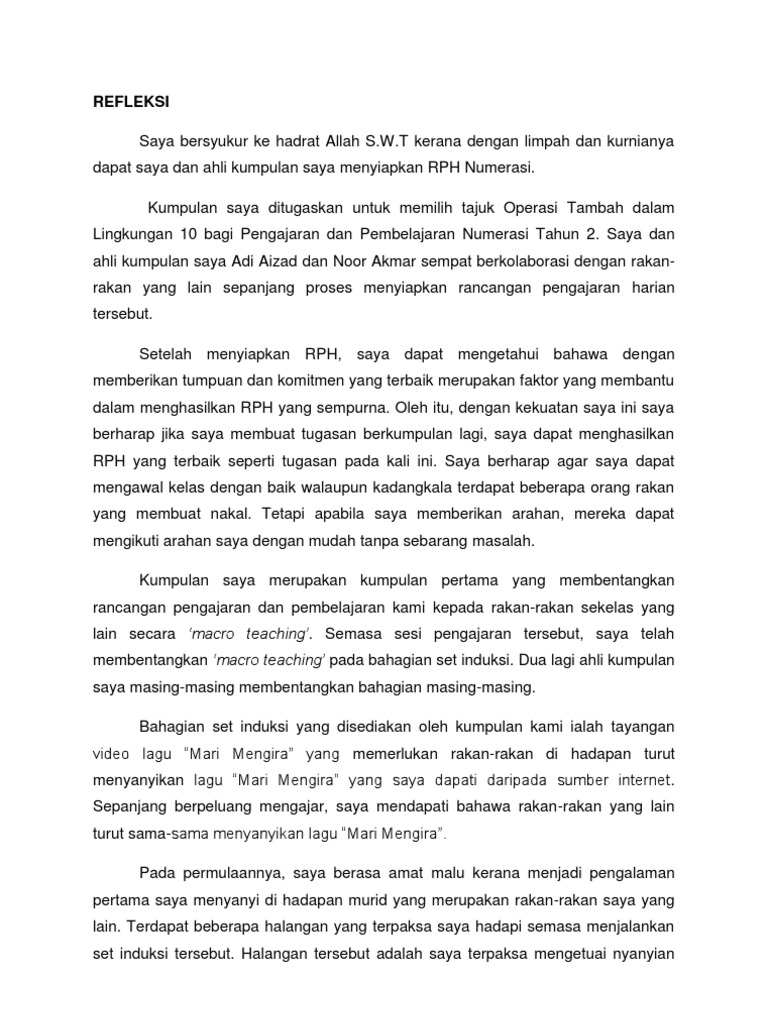 Contoh Refleksi Pengajaran Dan Pembelajaran