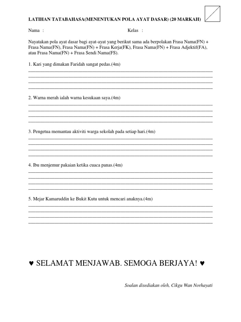 Latihan Tatabahasa Menentukan Pola Ayat Dasar Tingkatan 4