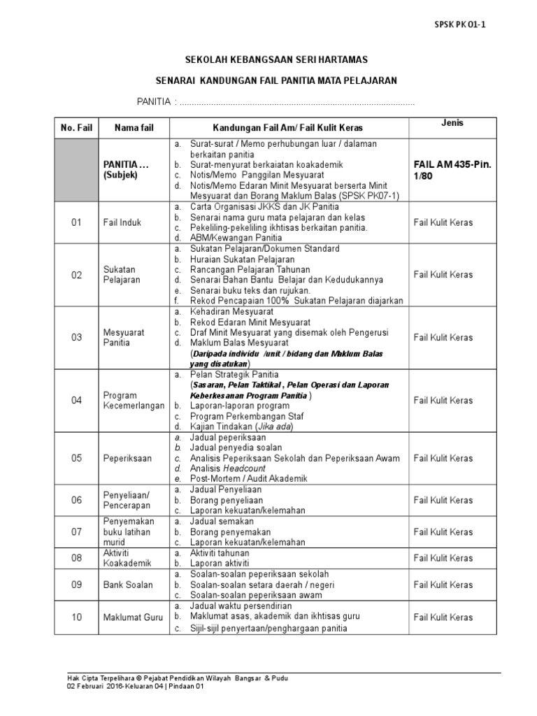 Senarai Kandungan Fail Panitia Mata Pelajaran Lengkap