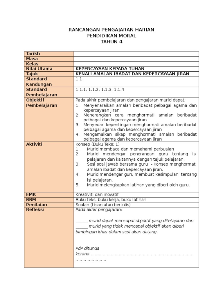 Doc Rancangan Pengajaran Harian Pendidikan Moral Tahun 4 Mem Mm Academia Edu