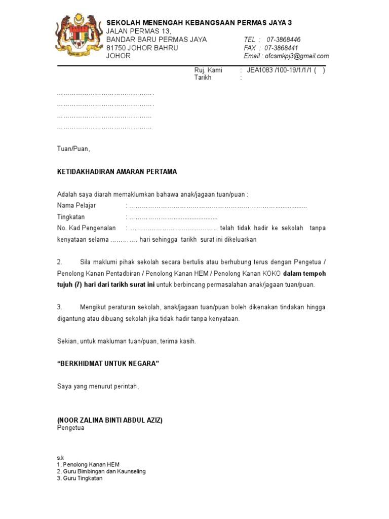 Surat Amaran Tidak Hadir Ke Sekolah Doc