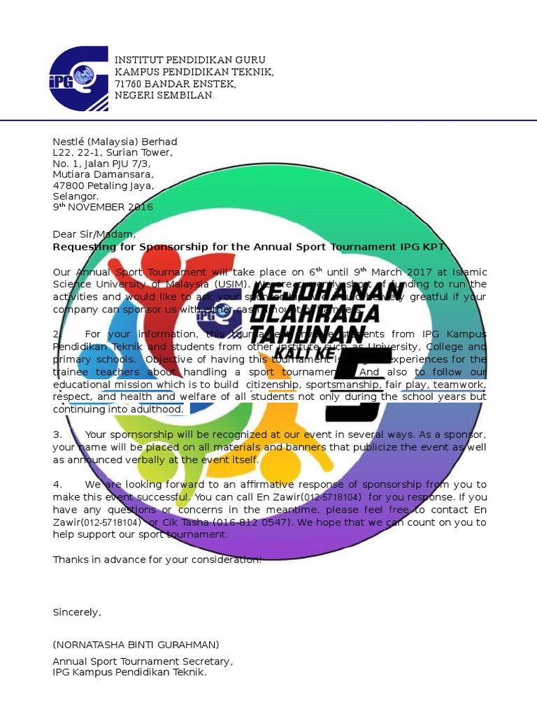 Doc Surat Permohonan Tajaan Milo 2016 Copy Hazmuhaimin Hashim Academia Edu
