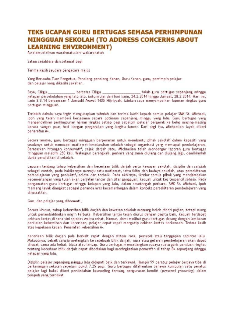 Teks Ucapan Guru Bertugas Semasa Perhimpunan Mingguan Sekolah