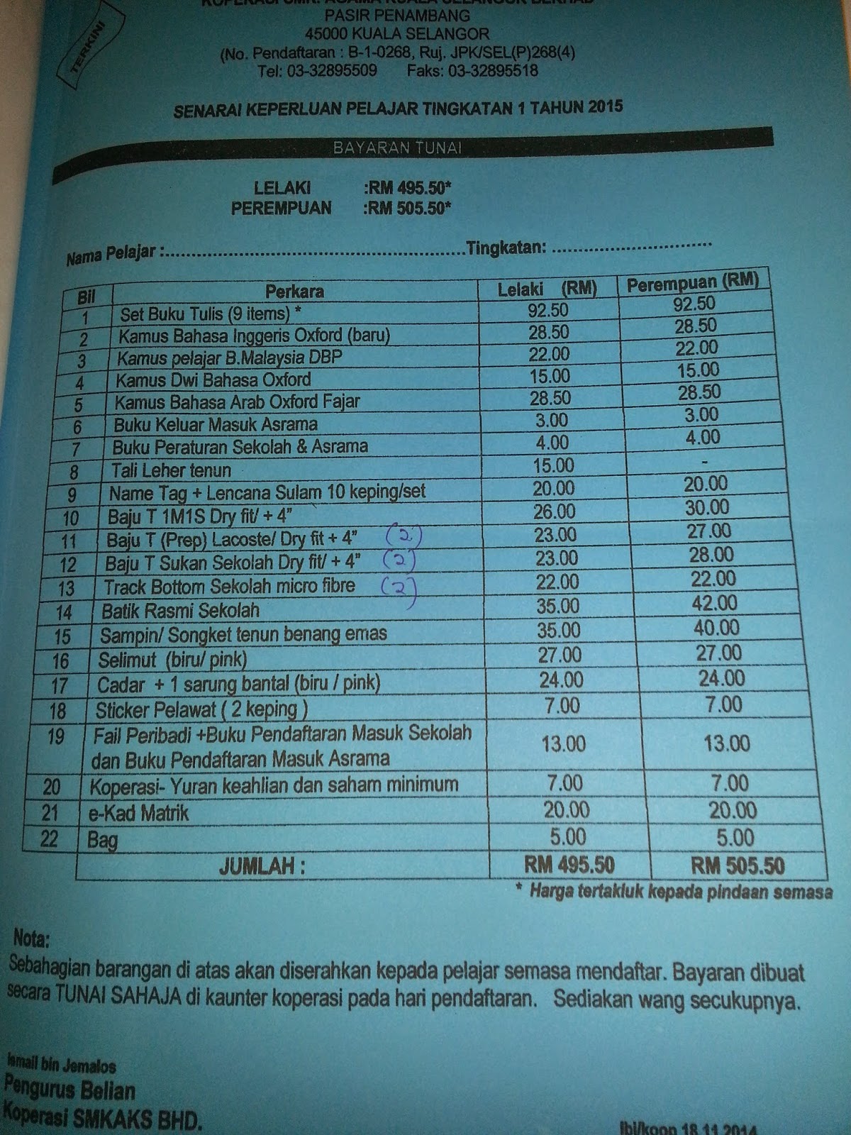 Kos Yuran Masuk Ke Tingkatan 1 Sekolah Berasrama Penuh